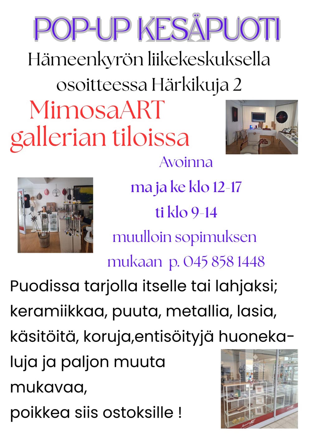 POP-UP KESÄPUOTI Hämeenkyrön liikekeskuksella, Mimosa ART gallerian tiloissa, Härkikuja 2